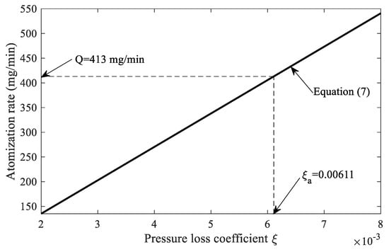 According to our experimental findings, atomization was not detected below 20 V. Therefore, the displacement amplitude (or volume variation) at that value was used as a threshold (). Thus, the effective volume used for the numerical results was given as . The changes in volume due to deformation of the apertures was neglected for the calculations of the atomization rate, since it was very small compared to the total volume change . On the other hand, the pressure loss coefficient is difficult to accurately assess its value, since the actual micro-apertures are manufactured by micro-abrasion electroforming and drilling techniques, which, in practice, give irregular conical shapes and edges [7]. Thus, in order to obtain an estimate of the approximate value of the loss coefficient , correlated to the experimental atomization rate () obtained at 80 V and 110 kHz, the following procedure was implemented. Figure 16 shows the linear relation (solid line) between the atomization rate and the pressure loss coefficient as given in Equation (7). By using this linear estimate, an approximate value of corresponding to the experimentally determined atomization rate () was estimated. The value was found to be smaller than the theoretical one ( for an ideal conical shape micro-aperture, but this can be a consequence of the actual conditions found in the micro-apertures of the experimental ultrasonic atomizer.