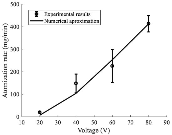 Using the found loss coefficient (, an approximation of the atomization rate as a function of the voltage can be obtained using Equation (7). The variations of the volume were calculated for every displacement distribution of the thin plate as given by the FEM at the resonance frequency of 110 kHz. For these calculations, the loss coefficient was kept constant.