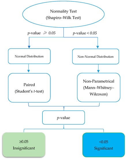 - Mann–Whitney–Wilcoxon test to evaluate the differences between two independent non-normal distributions [41].