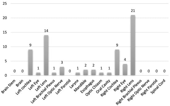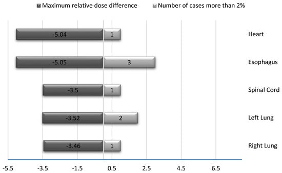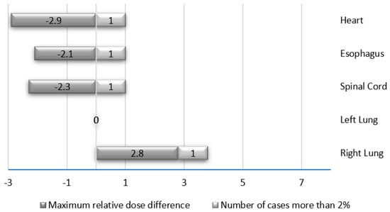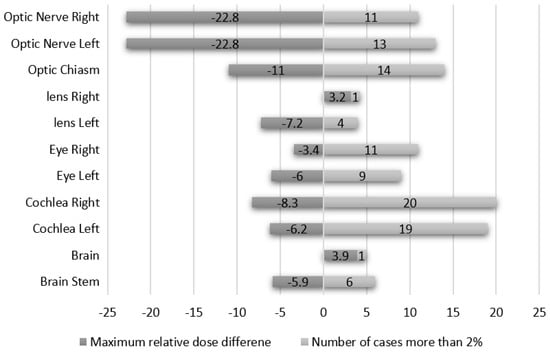 In terms of relative dose distribution differences, normality test revealed that most of the 20 critical structures did not exhibit a normal distribution, except brain stem, brain, oral cavity, esophagus, larynx, and spinal cord. Wilcoxon signed rank test and t-test indicated that dose differences were found to be significant only for brain stem, brain, optic nerves, esophagus, optic chiasm, right brachial plexus, and spinal cord. The number of patients with a maximum relative dose difference of more than 2% for each critical structure is summarized in Figure 3.