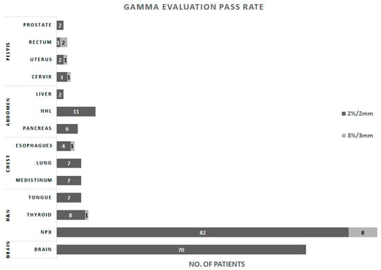 The gamma evaluation results satisfied the 2% and 2 mm criteria for 212 patients; the other 14 patients failed these criteria with a chest plan recording the lowest pass rate of 88.6% (see Figure 6). All 226 patients, however, satisfied the 3% and 3 mm criteria with an average pass rate of 98.2 ± 1.2.