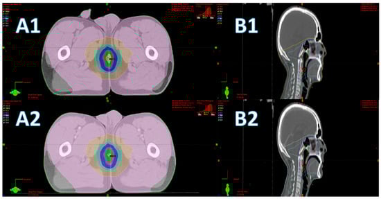 Reduced gamma pass rates in some patients’ plans are the result of patients geometrical differences between NCCT and CCT scans. Subset A shows the difference in geometry due to penile movement, (A1) NCCT, and (A2) CCT. Subset B shows respiratory induced oral cavity movement between NCCT (B1) and CCT (B2).