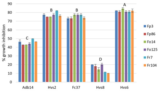 The strain Hvs6 significantly showed the highest percentage of fungal growth inhibition (81–84%) for all tested isolates of F. proliferatum, F. oxysporum f. sp. asparagi and F. redolens. FC37 and Hvs2 inhibited up to 73 and 82% the growth of the fungal isolates assayed, respectively. The Adb14 strain reduced the mycelial growth from 41 to 50%. Hsv8 showed the lowest ability for mycelial growth inhibition (10–20%; Figure 1 and Figure 2).