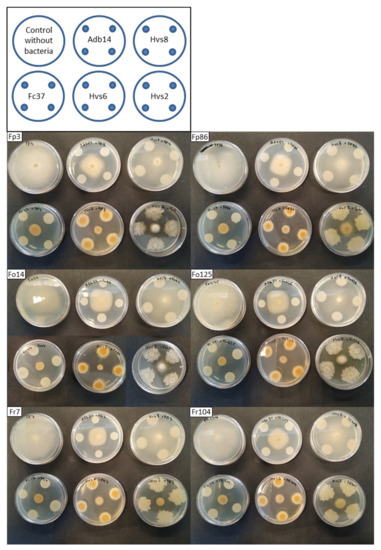 Dual confrontation experiments showing the inhibition of the fungal mycelial growth of Fusarium proliferatum (isolates Fp3 and Fp86), F. oxysporum f. sp. asparagi (isolates Fo14 and Fo125) and F. redolens (isolates Fr7 and Fr104) by the bacterial strains Adb14, Hvs8, FC37, Hvs6 and Hvs2.