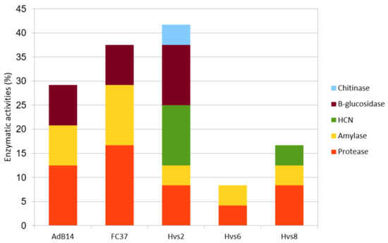 Percentage of biocontrol enzymatic activities displayed by strains Adb14, FC37, Hvs2, Hvs6, and Hvs8.