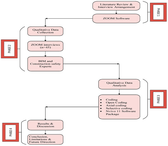 The flowchart of the research methodology is shown in Figure 1. The first stage of the research methodology was a literature review and interview arrangement with the ZOOM software application. The second stage of the research methodology started after the ZOOM software was successfully mounted on the laptop. The second stage comprised the collection of qualitative data, including 45 safety and BIM experts with realistic knowledge of BIM implementation in the construction industry. The third step of the study approach consisted of qualitative data analysis with the aid of the NVivo software package. The qualitative data were analyzed by open coding, axial coding, and selective coding as part of the coding process. In the fourth and final stage of the research methodology, an explanation of the data outcomes and results with conclusions, limitations, and future directions was illustrated.