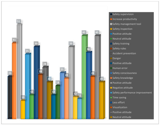 A thorough description of the coding scheme is shown in Figure 2. It is illustrated that a total of 593 codes were obtained. The division of codes offers evidence that the highest number of codes refers to the ‘safety management tool’, while the lowest number of codes refers to ‘negative attitudes’. This scenario shows that a picture of utilizing ‘safety management tools’ is necessary for enhancing safety performance.
