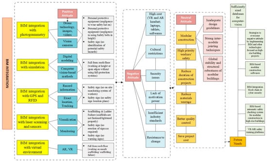 Despite the positive attitude associated with the use of technologies, several negative attitudes were dispalyed during the interview session. The second group of interviewees believed that BIM integration with other emerging technologies is not easy and seamless for organizations to adopt this technique. They supported their claim by presenting evidence, such as high prices, cultural limitations, insufficient BIM skills and training sessions, government policies, security concerns, inadequate industry standards, lack of incentives to incorporate BIM in construction projects, and resistance to change. However, the literature study also supports their viewpoint that various restrictions and limitations prevent the implementation of BIM in construction projects [117]. For example, the purchase cost of VR and AR headsets with complete features for use in construction projects could be as low as $500 [42] while the cost of hardware components, such as laptops, tablets, and motion trackers, and the cost of support systems could easily rise to $5000. In addition, a developer must be hired to create an immersive test environment for the efficient use of on-site technology and this requirement entails significant costs [42]. In addition, the security risks of construction projects are also a big challenge for developers to integrate BIM with block chain and cyber-security technologies for security enhancement. There is no question that several studies have been carried out to address obstacles and limitations to the implementation of BIM and other emerging digital technologies, but further work needs to be done in the future to enhance the safety performance of construction and thus to embrace and incorporate revolutionary technologies.