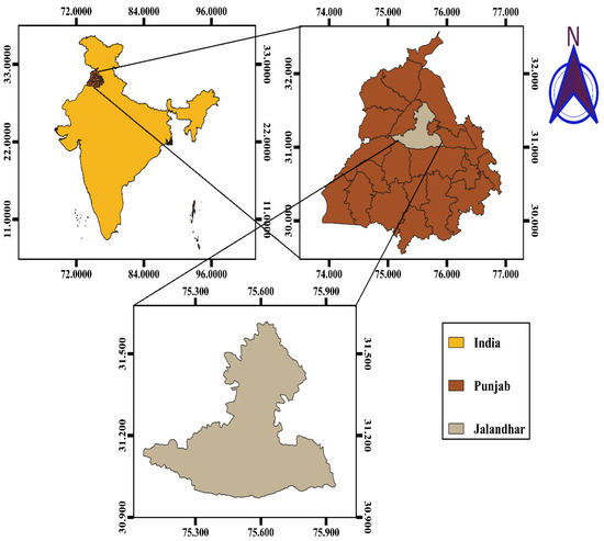 The current area of assessment was District Jalandhar, Punjab. This District is located between two rivers; Beas and Sutlej. Loamy soil is mainly found in this area, which is due to the cool to warm climate based on sub-moist environments [34]. The geological substrate consists of alluvial deposits from the Quaternary age associated with 81 Indus allivial plains [35]. It makes up approximately 5.35% of the area of Punjab, and is one of the most highly populated areas of Punjab. The land consists of 90% agriculture, 7.4% non-agriculture and 2.1% forests. It has an extensive setup of roads and is a significant location for agriculture as well as textile and automobile spare part factories [32]. The climate of the study area is normally very hot during the summer season and very cold during the winter season, with rice and wheat as the main crops in the study area. The annual rainfall is about 600 mm year−1. When samples were collected, the humidity was 77% and the temperature was 18 °C.