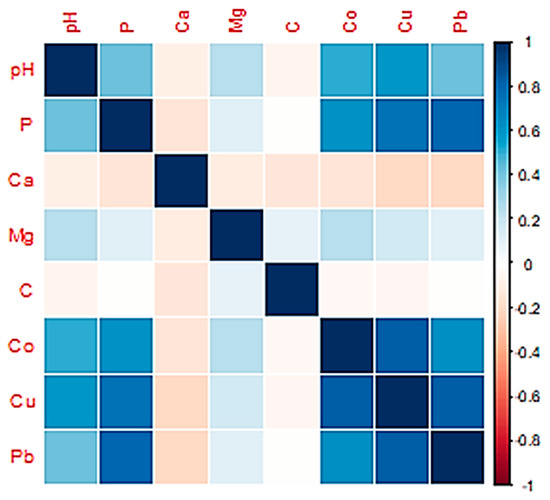Samples were collected at a depth of 0–15 cm from 70 locations in triplicates from Jalandhar (India) (Figure 1). Soil samples were air-dried and analyzed for various chemical parameters (pH, phosphorus (P), Ca, Mg, and organic carbon (C)) and PTEs (Co, Pb and Cu). Soil pH was measured by employing micro pH Analytical pH-meter in 1:2 soil/water extracts [36]. The Olsen method was applied to determine phosphorus [37], while calcium and magnesium were determined through EDTA titrations [38]. Walkley-Black wet oxidation method was used to determine C content [39]. The pseudototal Co, Cu and Pb contents were determined by acid digestion using aqua regia (HNO3: HCl, 1:3 v/v). One gram of each oven-dried soil sample was digested with 12 mL of aqua regia and the solution was heated on the hot plate for 1–2 h. The digested samples were filtered and diluted with 50 mL of steam distillation water and used for analysis. Element analysis in the extracts was resolute by atomic absorption spectrophotometer (AAS) (Model Agilent Technologies 200-Series AA). The limits of detection of the instrument are as follows: 5 µg L−1 for Co, 1.2 µg L−1 for Cu and 14 µg L−1 for Pb. More details are given in Kumar et al. [33].