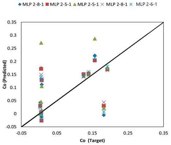 The neural network models based upon MLP were executed by employing MATLAB software. The selection of input variables is the initial step in soft computing-based models’ development. In this study, models were developed using pH, P, Ca, Mg and C variables. Model development is a trial-and-error process. A larger dataset was used for model preparation, and other (smaller) datasets were used for model testing and validation. Different input combinations were used to be developed for predicting the Co, Cu and Pb. After analyzing Pearson’s correlation matrix, five different models were developed. The different models are developed using a number of neurons in the hidden layer, and number of runs for output variables are Co, Cu and Pb. Figure 4 indicates the scatter plot of target and predicted values of Co using various MLP models. MLP-2-8-1 lies significantly closer to the line of perfect agreement (1:1) with lesser deviation. The model MLP-2-8-1 is best for predicting Co content, and the 2 signifies the number of input combinations (pH and phosphorus), while the 8 represents the number of neurons in a single hidden layer.