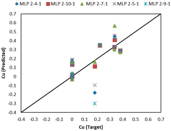 Scatter plot of target vs. output Cu employing numerous neural network models based on MLP in validation stage.