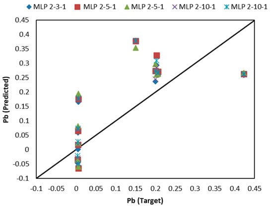 Scatter plot of target vs. predicted Pb using various neural networks models based upon MLP in validation stage.