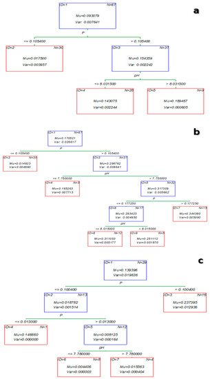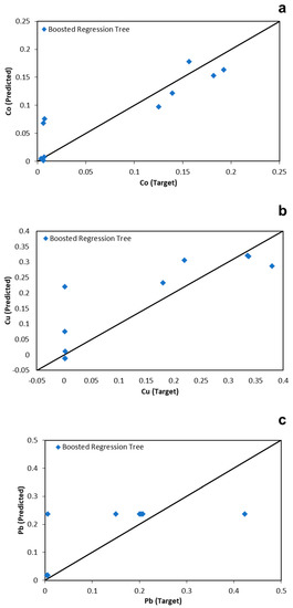 Excerpt of input variables is the initial step in developing BT-based models. In the present paper, the model was established using pH, P, Ca, Mg, and C. Model development is a similar process as that followed by the MLP-based model development. Figure 8 indicates the BT model-based tree graphs for Co, Cu and Pb, respectively. The BT regression trees were obtained for Co, Cu and Pb using soil properties as forecasters. The root nodes of the regression tree in Co, spilt on phosphorus and pH, were also splitting variables into trees. It is assumed that lower phosphorus content is allied with greater Co retention, and pH is also an imperative variable in the retention of Co [48]. In the BT regression model of Cu and Pb, the root nodes of the regression tree also spilt on phosphorus and pH, and both these variables are imperative in maintaining Cu and Pb [49]. The agreement plots for target values and predicted values of Co, Cu and Pb are shown in Figure 9, respectively, using a validation dataset. CC and RMSE values of Co, Cu and Pb using BT-based models are listed in Table 5.