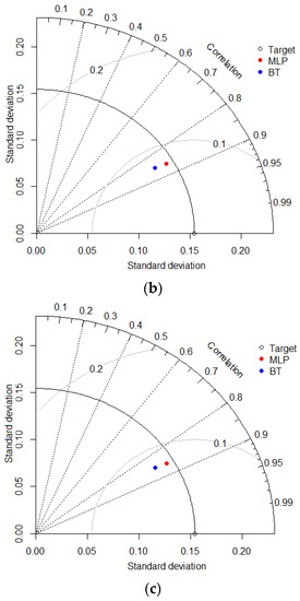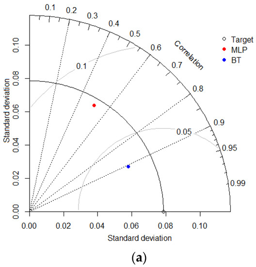 To better elucidate the model prophecy impact further, we applied the Taylor diagram [52]. The nearer the pentagram was to this line, the nearer the prophecy was to determine the Cu, Co and Pb concentration prediction [53]. The Taylor diagram is a polar graph in which the cosine of the angle amid the X-axis is the CC in Cu, Co and Pb of the model. The radial direction is the ratio of model to metals standard deviation. The grey arcs signify the RMSE normalized by the standard deviation for the apiece model [54]. Figure 10 shows the Taylor diagram for the comparison coefficient of correlation and RMSE in the validation stage for predicting Co, Cu and Pb using applied models. This suggests that MLP-established models perform better than BT-built models for predicting the Cu and Pb, whereas BT models perform better than MLP-based models in predicting the Co. Overall, the neural network models based on MLP are closer to the line and fit well, in contrast with other models for predicting the concentration of Cu, Co and Pb.