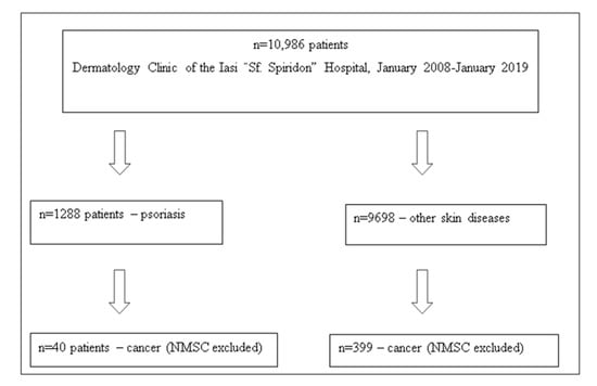 This 10-year retrospective study included 10,986 patients admitted to the Dermatology Clinic of the Iasi County “Sf. Spiridon” Emergency Hospital. Patient data were collected from the hospital database. The diagnoses of psoriasis and malignancy were based on the national diagnosis codes L40.0-L40.9 for psoriasis and C00-96 and D00-D09 for malignancies, respectively. Of a total of 10,986 unique in-patients admitted to our clinic, 1288 were diagnosed with psoriasis (group 1) and 9698 with other skin diseases (group 2).