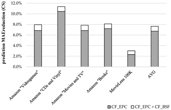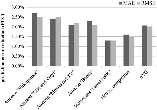 The proposed algorithm achieves an average prediction MAE reduction of 2% and an average prediction RMSE reduction of 2%, as well, when using the CS user similarity metric. At the individual dataset level, the performance edge of the proposed algorithm against the plain CF algorithm, ranges from 1.2% and 1.1% (for the MovieLens 100K dataset) to 2.3% and 2.5% (for the Amazon “Videogames” dataset), for the MAE and the RMSE metrics, respectively.
