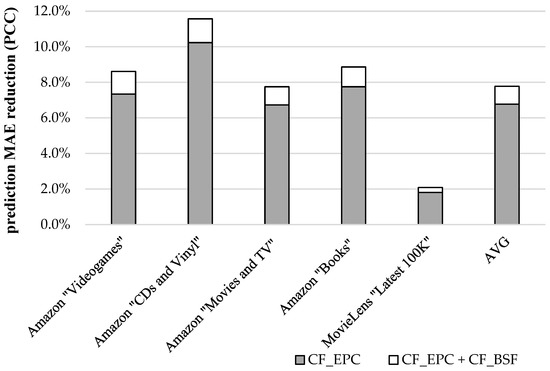 Towards this direction, the third experiment aims at assessing the rating prediction accuracy improvement when combining the proposed algorithm with another CF rating prediction accuracy approach. In particular, we report on our experiments where the proposed algorithm is combined with the CFEPC algorithm [54]. The CFEPC algorithm is a state-of-the-art algorithm (published towards the end of 2020), also targeting at improving the CF rating prediction accuracy, and not needing any additional information on the items or the users (e.g., user social relationships or item categories). Hence, it can be also applied in all CF datasets. Figure 4 illustrates the improvement in the MAE achieved by the inclusion/combination of the presented algorithm to the CFEPC algorithm, when using the PCC as the similarity metric and again taking the performance of the plain CF algorithm as a yardstick.
