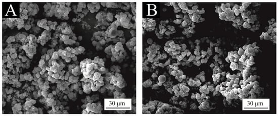 SEM morphology of microcapsules: (A) without rice husk powder and (B) with rice husk powder.