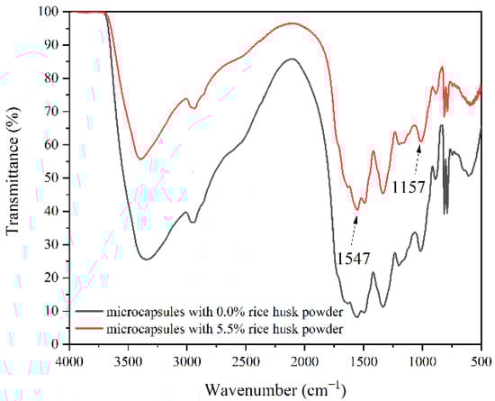 The SEM morphology of microcapsules with and without rice husk powder was analyzed as shown in Figure 1. Compared with Figure 1A, the microcapsules with rice husk powder content of 5.5%, which was showed in Figure 1B, had little agglomeration, good morphology, and uniform particle size. In Figure 2, the absorption peak at 1547 cm−1 belongs to -NH- stretching vibration peak, which is the characteristic peak of melamine resin. Compared with the microcapsules without rice husk powder, the infrared spectrum of the microcapsules with rice husk powder in the wall material split at 1157 cm−1, and the peak type changes. It can be inferred that this peak is affected by the C-H vibration of aromatic core and the C-O-C antisymmetric “bridge” stretching vibration peak in rice husk powder, and it can be judged that the wall material of microcapsule contains cellulose. The absorption peaks at other positions of microcapsules with 5.5% rice husk powder in the infrared spectra are consistent with the microcapsules without rice husk powder. The chemical composition of the microcapsules has not changed, so it can be concluded that the microcapsules are successfully prepared.