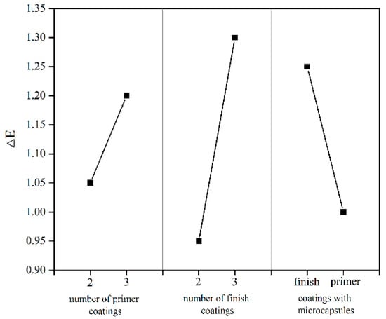 The influence of coating processes on chromatic aberration of waterborne coatings containing microcapsules is shown in Table 2. The difference between waterborne coatings prepared by different coating processes is not significant. However, on the whole, the chromatic aberration of coatings is relatively minimum when microcapsules are added to the primer. When microcapsules are added into the finish, the chromatic aberration of the coating is slightly larger than that of the primer. Because microcapsules are particles, which affect the uniformity of the coating, the chromatic aberration of the paint film is enhanced. Table 3 and Figure 3 show the chromatic aberration analysis of orthogonal experiment. The greater the range, the more significant the influence of this factor. By comparing the range value, the influence of number of finish coatings on chromatic aberration of paint film is the most obvious, and the influence of number of primer coatings on chromatic aberration of paint film is the least.