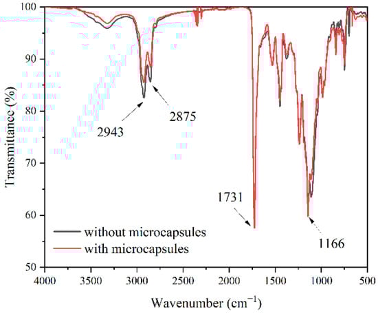 As shown in Figure 5, it can be observed that for the coating with the microcapsules added into the primer by the method of three times of primer and two times of finish, the characteristic absorption peaks of methyl and methylene are at 2943 cm−1 and 2875 cm−1, the strong and sharp absorption peak is -OH at 1731 cm−1, and the characteristic absorption peak of carbon oxygen single bond in ester group is at 1166 cm−1. Because the microcapsules do not change the chemical composition of the coating, the spectra of the two coatings are relatively similar. In order to better visualize the change of polymer film with the microcapsules, Figure S1 shows the infrared spectrum of paint film with microcapsules and microcapsules alone.
