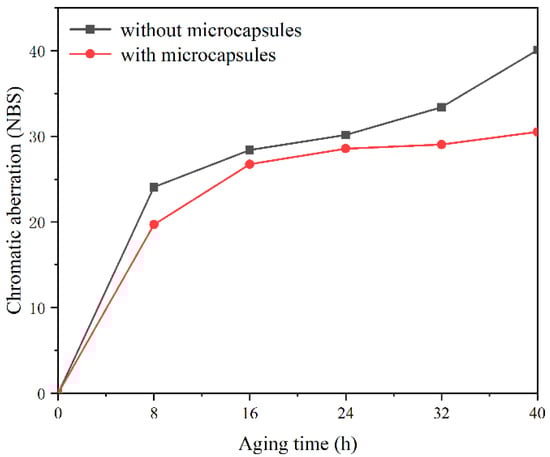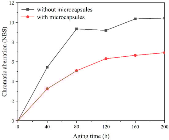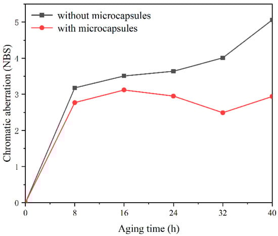 From the above results, when shellac microcapsules coated with melamine/rice husk powder are mixed to the waterborne paint primer, the coating process of “three times of primer and two times of finish, microcapsule added into the primer” is better. The aging resistance test results of waterborne coatings without microcapsules and that with 6.0% microcapsule were analyzed. As shown in Figure 6, when the aging time was 8 h–40 h in the oven at 120 °C, the chromatic aberration of the coating with 6.0% microcapsule increased from 2.77 to 2.94, and that of the coating without microcapsule increased from 3.18 to 5.06. As shown in Figure 7, the chromatic aberration of the coating with 6.0% microcapsules increased from 19.70 to 30.51, and that of the coating without microcapsules increased from 24.06 to 40.07 when the aging time was 8 h–40 h in the oven at 160 °C. As shown in Figure 8, with the aging time in the UV climate resistance test chamber increased from 40 h to 200 h, the chromatic aberration of the coating with 6.0% microcapsules increased from 3.25 to 6.92, and the chromatic aberration of the coating without microcapsules increased from 5.44 to 10.44. It illustrated that during the aging process, the chromatic aberration of the coating would gradually increase with the aging time. Based on the two different high-temperature aging processes, the chromatic aberration of the coating without microcapsule increases more than that of the coating with microcapsules. This is because the wood itself will carbonize to change the chromatic aberration in the high temperature environment. In addition, the microcapsules will break and release the core material from the milky yellow microcapsule during the aging process, increasing the protection of the coating on the wood surface. Therefore, the chromatic aberration is changed indistinctively.