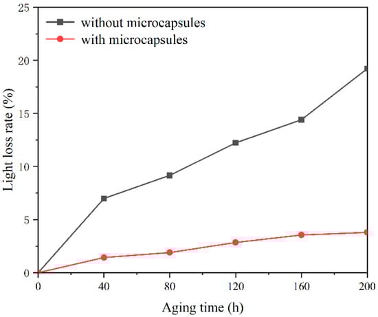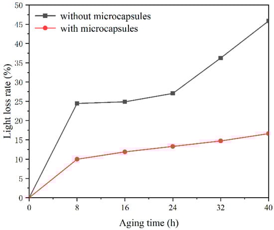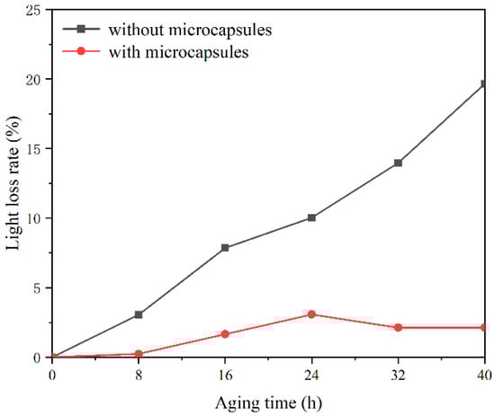 When the coating was at 120 °C, as shown in Figure 9, the light loss rate of the coating without microcapsule reached 19.65% for 40 h, and that of the coating with microcapsule addition of 6.0% was 2.13% for 40 h. It indicates that the gloss of the paint film decreases only slightly. As shown in Figure 10, when the coating was at 160 °C, the light loss rate of the coating without microcapsules reached 45.85% for 40 h, and the light loss rate of the coating with 6.0% microcapsules reached 16.63% for 40 h. As shown in Figure 11, when the coating was in the UV weather resistance test, the light loss rate of the coating without microcapsule was 19.21% for 40 h, and the light loss rate of the coating with microcapsule addition of 6.0% was 3.80% for 40 h. The results show that the light loss rate of the coating increased with the increase of aging time. During the aging process in the oven at 120 °C, the light loss rate decreased slightly from 24 h to 32 h. It may be because the microcapsule breaks caused by the micro crack on the coating surface, and the outflow of core material has the excellent repair effect on the coating. At this time, the repair effect was higher than the aging cracking strength of the coating, which reduced the gloss loss of the coating. After 32 h, the aging strength was still increasing, while the number of microcapsules with the repair effect in the coating decreased, resulting in the gradual decrease of overall repair strength and the increase of light loss rate. During the aging process in the oven at 160 °C and UV climate resistance test chamber, with the too-high aging strength, the microcapsules could also improve the aging resistance of the coating. The plant fiber, which is the composition in the microcapsule wall material, enhanced the toughness of the coating, fundamentally reducing the generation of cracks in the coating during the aging process. The microcapsules distributed in the coating broke under stress after the cracks occurred. The repair agent, as the core material, flowed to the crack to inhibit the generation of crack. This made the light loss rate of the coating surface increase slowly, while the coating without microcapsules did not have this ability.