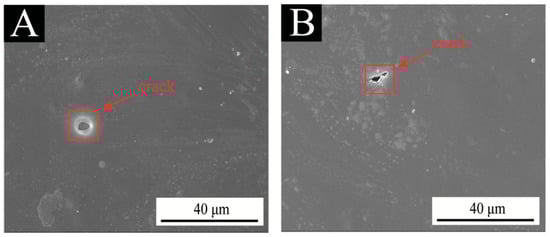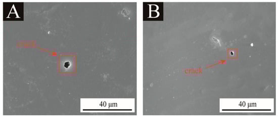 The SEM images of the coatings without microcapsules and with 6.0% microcapsules in which wall material contained 5.5% rice husk powder after aging test in the oven at 120 °C, at 160 °C and UV weather resistance test chamber are shown in Figure 12, Figure 13 and Figure 14. It can be seen that the coating on the wood surface without microcapsules is obviously damaged after the aging test (Figure 12A, Figure 13A and Figure 14A). There are damages and cracks, and the maximum crack size is close to 40–50 μm. The coating with 6.0% microcapsules is not easy to crack in the aging process (Figure 12B, Figure 13B and Figure 14B). It may be that the waterborne coating with 6.0% microcapsules has the better elongation at break, good toughness and strong environmental adaptability. Even if the microcracks occur in the high-temperature environment, the microcracks will cause the microcapsule wall in the coating to break, and the core material will flow out and solidify at the crack, so as to inhibit or reduce the expansion of cracks and damage. However, the coating without microcapsules is prone to produce the cracks, and the cracks will continue to expand under the continuous action of environmental factors. It is directly proved that microcapsules can improve the aging resistance and thermal stability of waterborne coatings.