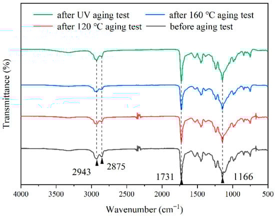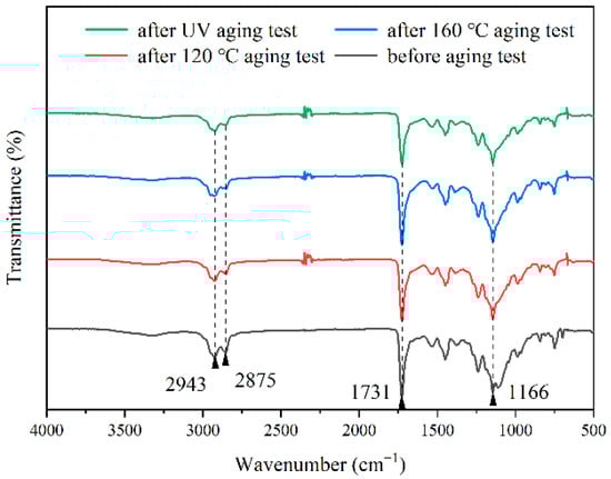 The change of chemical composition of waterborne coatings without microcapsules before and after aging tests can be observed in Figure 15. The characteristic absorption peaks of methyl and methylene are at 2943 cm−1 and 2875 cm−1. The characteristic absorption peak of -OH is at 1731 cm−1, and the characteristic absorption peak of carbon oxygen single bond in ester group is at 1166 cm−1. The chemical composition of the waterborne coating before and after aging does not change, indicating that the aging test will not cause chemical reaction of the coating. Figure 16 is the infrared spectrum of the coating with 6.0% microcapsule before and after aging. It is observed that the characteristic peak positions are basically the same and the chemical composition has no change, indicating that there is no chemical reaction before and after the aging resistance test of the coating with 6.0% microcapsules.