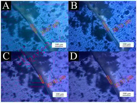 The QFH-HG600 film scribing instrument (Dongguan Huaguo Precision Instrument Co., Ltd., Dongguan, China) was used to test the adhesion of the coating. The cutting tool was used to apply force evenly perpendicular to the coating surface, and then the cutting lines were formed on the coating. The above operations were repeated on the coating surface to form a 90° intersection with the original cutting lines to achieve a grid pattern. Then the grid was covered completely with adhesive tape, and the adhesive tape was held for a period of smooth tearing within 5 min. The coating adhesion grade was determined according to the coating breakage on the tape. There were grades of 1–5 in total, and grade 5 was the worst [38].