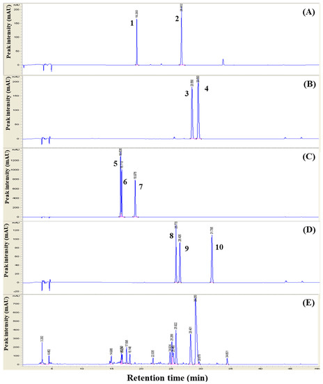 The high-performance liquid chromatography profile of Three Herb (3Hb) and 3Hb extract 3Hb means Rhizome of Coptis chinensis, Rhizome of Glycyrrhiza uralensis, and fermented Semen of Glycine max. Markers were eluted in the standard solution (Rhizome of Glycyrrhiza uralensis (A), Rhizome of Coptis chinensis (B), fermented Semen of Glycine max (C,D)), 3 Hb extract (E). Peak number: markers of liquiritin (1), liquiritigenin (2, berberine (3), palmatine (5) and isoflavones such as daidzein (5), glycitein (6), genistein (7), daidzin (8), glycitin (9), and genistin (10).