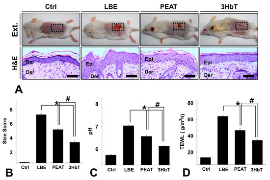 The alleviation of symptoms of lipid barrier elimination using Three Herb (3Hb) extract. (A) The alleviation of symptoms of lipid barrier elimination. The lipid destruction-induced skin lesions were relieved in 3HbT compared to PEAT and LBE. Clinical skin score (B), pH (C) and TEWL (D) was significantly lower in 3HbT compared with PEAT and LBE (Immunohistochemistry; bar size, 50 µm). 3Hb, Rhizome of Coptis chinensis, Rhizome of Glycyrrhiza uralensis, and fermented Semen of Glycine max; Ctrl, the normal group; LBE, lipid barrier elimination group; 3HbT, 3Hb treated group after lipid barrier elimination; Ext., External morphology; H&E, Hematoxylin and Eosin stain; Epi, epidermis; Der, dermis; * p < 0.05 compared to LBE; # p < 0.05 compared to PEAT.