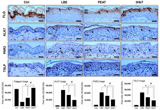 The regulation of filaggrin and inflammation using Three Herb (3Hb) extract. The expression of FLG was significantly higher in 3HbT compared to PEAT and LBE. The expression of KLK7, PAR-2, TSLP (light brown particles indicated by arrows) was significantly lower in 3HbT compared to PEAT and LBE (immunohistochemistry; bar size, 50 µm). The data of image analysis for positive reaction showed the same results. 3Hb, Rhizome of Coptis chinensis, Rhizome of Glycyrrhiza uralensis, and fermented Semen of Glycine max; FLG, Filaggrin; Ctrl, the normal group; LBE, lipid barrier elimination group; 3HbT, 3Hb treated group after lipid barrier elimination; KLK7, kallikrein7; PAR-2, protease-activated receptor-2; TSLP, thymic stromal lymphopoietin; Epi, epidermis; * p < 0.05 compared to LBE; # p < 0.05 compared to PEAT.