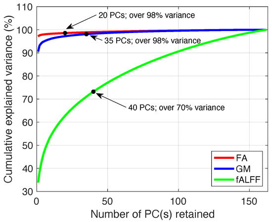 We performed PCA on each dataset separately and calculated the cumulative explained variance (shown in Figure 2). From Figure 2, we can see that the variance retained for the FA and GM datasets follows a similar pattern, which differs from that of the fALFF dataset. For this reason, the criteria for order selection were similar for the FA and GM datasets. We used 98% as the threshold for the variance retained for the FA and GM datasets in order to balance the retention of the most signal while minimizing the effects of noise. As a result, the orders used for FA and GM datasets were 20 and 35, respectively.