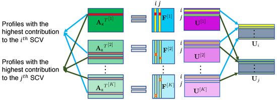 Identification of “one-to-many associations”. In the first modality, the indices of the largest absolute value of the coefficient in the ith column and the jth column of are the same, meaning that the same subject profile (marked in red) makes the highest contribution to the ith SCV and the jth SCV. This subject profile from the first modality is associated with the two subject profiles from the second modality and two subject profiles from the Kth modality.
