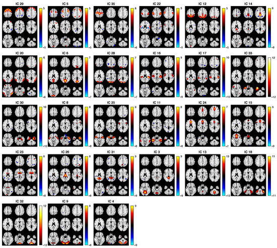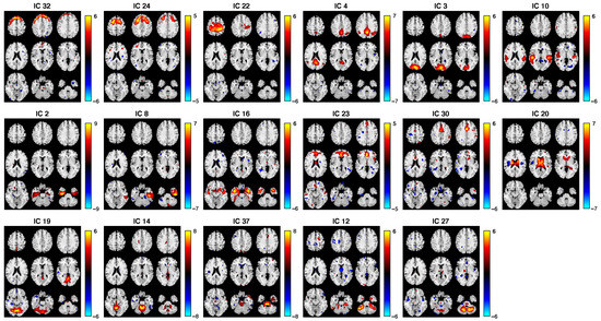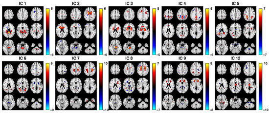 To remove artifacts caused by body movements such as breathing and heart beating, we eliminated ICs from the brain ventricles or areas where large blood vessels are located [69,70]. We also eliminated ICs that were spread across wide regions of the brain or at the edges of brain images to remove motion-related signals [57,71]. More specifically, for the FA, we removed the ICs with spotty, diffusely distributed patterns over most of the brain, which represented noise. For the sMRI, we removed the sinus susceptibility noise and WM components [72]. For the fMRI, we removed ICs that were located beyond the area of GM; e.g., ventricles, skull, and surrounding tissue, WM, frontal/sagittal sinus susceptibility noise, CSF, and motion artifacts with ring patterns [72,73,74,75,76,77]. As a result, 10, 27, and 17 ICs were retained for FA, GM, and fALFF datasets, respectively. Their corresponding subject covariations were formed into three reduced subject covariation matrices with sizes of (FA), (fALFF), and (GM), which were then used in the IVA step. The spatial maps of the retained components were converted to Z-scores and thresholded at (Figure 4, Figure 5 and Figure 6).