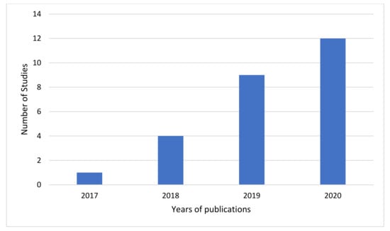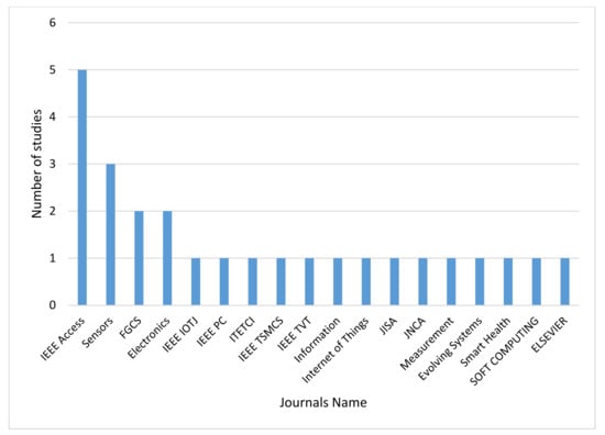 Figure 3 and Figure 4 illustrate the list of selected papers published according to year and journal. Noticeably, there is a trend toward anomaly-based intrusion detection in IoT, using deep learning. This signifies a rising interest in this domain, especially after 2018. An elevated increase of nine studies in 2020 was noted, compared to only five studies in 2019. In comparison, the trend seems to start in 2017, as there was only one study published.