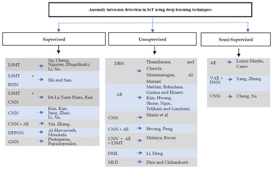 Recently, various studies have explored the application of anomaly detection in IoT using deep learning. For better insight, taxonomy is shown in Figure 5 to pinpoint all existing techniques and requirements of anomaly intrusion detection in IoT, using deep learning techniques. The IDS are commonly categorized as supervised, unsupervised, and semi-supervised.