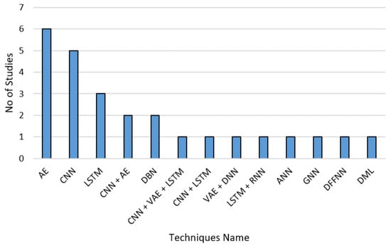 Table 4 shows the accuracy range for each deep learning technique used. The CNN has a wide range that starts from 76.76% and reaches 99.88%; this technique was tested 10 times individually and integrated with another technique. In addition, AE covers a wide range starting from 80% and reaches 99.81%, and it is similar to CNN in the detection accuracy range and the one used. LSTM was used three times and achieved an accuracy between 79.58% and 98%. DBN was used two times and gained an accuracy range from 97% to 97.21 with little enhancement. RNN and DFFNN were used once. Figure 7 shows the techniques used in the studies.
