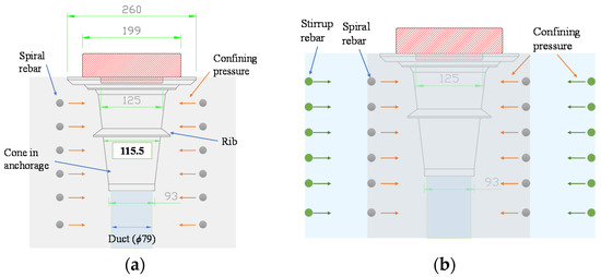 Essentially, the strength of anchorage devices and anchorage zones must be sufficient for the transfer of tendon force to the concrete, and the formation of cracks in the anchorage zone must not impair the function of the anchorage device [23,24]. AASHTO [25] classifies anchorage devices as basic and special anchorages. For a basic anchorage device with a simple bearing plate, as shown in Figure 1, prestressing force is transferred from prestressing steel to concrete only through the bearing plate on the supporting concrete surface and the bearing resistance () is expressed as a function of the relative size of the proportional supporting concrete surface area (A) to the gross area (Ag) of the anchorage bearing plate and the nominal concrete strength at the time of application of the tendon force (). A special anchorage device with one or more horizontal ribs to increase the net bearing area (Ab) could be used based on test qualification even though the bearing resistance, as determined by Equations (1) and (2), is lower than the required strength. Equations (1) and (2) do not consider the strength enhancement due to confinement of concrete by spiral rebars around the anchorage device, and they often lead to highly conservative designs for special anchorage devices with spiral rebars [16]. Furthermore, Equation (2) limits the effective supporting concrete surface area to 10.33 times the gross bearing area () without respect to reinforcement condition.