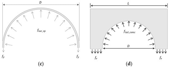 The second group, A12H-1 and A12H-3–7 was created to investigate the confinement effect induced by the spiral and the concrete surrounding the spiral. Two different spiral diameters (D = 295 and 745 mm) and two different sizes of spiral and stirrup rebar (Φ10 and Φ16 mm) were chosen under a constant of 1.82 or 9.52. Theoretically, as shown in Figure 2, the concrete surrounding the spiral may contribute additional lateral confinement with a pressure of , where (= is the modulus of rupture of concrete. However, this is only possible in the absence of bursting cracks, so the additional confinement effect of the surrounding concrete should be carefully considered. In the absence of cracking in the 550 and 800 mm specimens with spiral diameters of 295 mm, was calculated as 3.11 and 6.16 MPa, respectively.