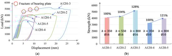 As shown in Figure 8, both A12H-6 and -7 show breakage of the anchorage devices at the ultimate state regardless of the reinforcement details, and the fracture modes were very similar to those of A12H-3 and -5. However, in the comparison of A12H-5 and -7, which only differed in spiral diameter, the peak loads and plastic behavior after the proportional limit of the load-displacement curves were different, as shown in Figure 9a. A12H-5 () exhibited a smaller peak value and softening behavior after the peak point, so the test was terminated, but A12H-7 () exhibited a long flat curve after the proportional limit, and it was tested up to about 20 mm displacement. The bearing plate of A12H-7 broke at a displacement of around 15 mm, and the fracture load was smaller, and the displacement at fracture was much smaller than those of A12H-3 and -6. This implies that deformation of the specimen was concentrated at the local zone below the bearing plate; then, local damage to the concrete leads to uneven support by the concrete, resulting in an excessive concentration of stress on the bearing plate followed by fracture of the plate.