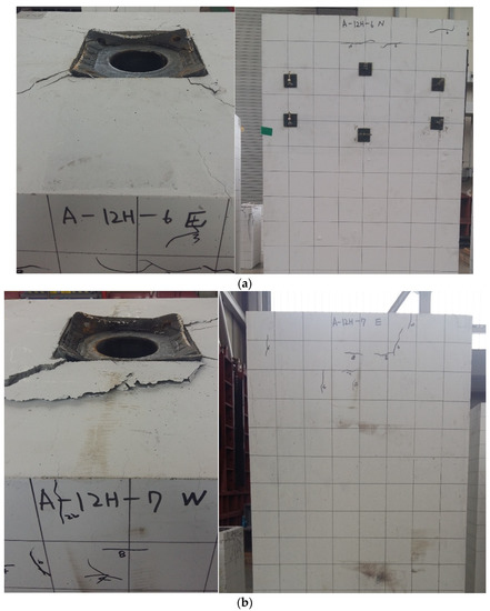 The first group of specimens from A12H-1 to 5 was made to investigate the effect of in the range from 1.82 to 9.52 under identical spiral conditions and to reinvestigate the numerical results of Cervenka and Ganz [8]. Figure 3a,b illustrate specimens with identical spirals but different values. Considering stress transfer from a smaller bearing plate to a larger concrete section, the stress dispersion ratio, m:n in Figure 1, can range from approximately 0.5:1 to 3:1, depending on the interaction between the two parts. Even though the bearing strength is not proportional to the dispersion ratio, a higher strength might be expected with higher .