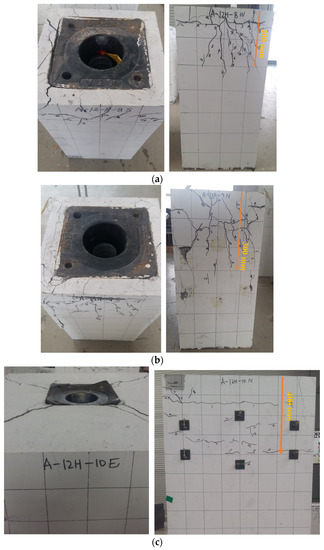 Figure 6 also shows that the length of the area with cracks and crack pattern depends on the size of the specimen and particular details of the reinforcement. In A12H-4, the length of the area through which cracks had propagated was approximately 200 mm, and most cracks grew in the vertical direction. In A12H-2, the length of that area was approximately 300 mm, and most cracks grew in the horizontal direction. These crack patterns might help to explain the fracture modes: a relatively small specimen with less lateral reinforcement is more likely to be affected by the wedge action of the anchorage device. On the other hand, a specimen with ≥ 4.50 is affected by both concrete crushing and/or spalling.