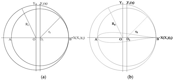 We thus obtain a symmetrical airfoil with a sharp tail. In order to change the thickness of the trailing edge, we need to improve the Joukowsky airfoil and move the large circle O along the OO1 direction. As shown in Figure 2a, where lBC is the moving distance of the big circle, other parameters remain unchanged, and conformal transformation is performed on the large circle again.