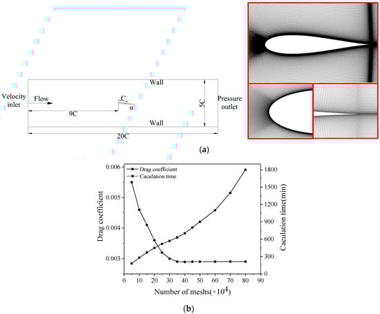 This paper uses the size of Joukowsky airfoil studied by Modi [25] as the original size for research. The LES Smagorinsky SGS (sub-grid-scale) model approach was adopted to resolve time-wise and space-wise variation in the flow due to large-scale eddies. The finite volume method was applied to discretize the differential equation, and the SIMPLE algorithm was used to solve the discrete equation. The accuracy of spatial discretization was second-order. The Green–Gauss node-based method was used to calculate the gradient and derivative of variables at the center of the element cell through Ansys Fluent numerical simulation, and heat transfer was not considered. As two-dimensional calculations can also obtain results that are relatively close to experimental ones [26,27], the airfoil was calculated using a two-dimensional model. The model uses the Integrated Computer Engineering and Manufacturing code for Computational Fluid Dynamics (ICEM-CFD) for grid division, and the airfoil outer flow field radius is 20 chord. The fluid domain and fluid mesh is shown in Figure 3a. In order to ensure that the number of elements in the mesh has no impact on the results, a mesh independence verification was carried out, as shown in Figure 3b; when the number of meshes reached a certain value, further increases in the number of meshes had no significant effect on the calculation results but increased the calculation time. Considering the balance between solution accuracy and calculation time, the number of meshes selected for this study was approximately 0.4 million.