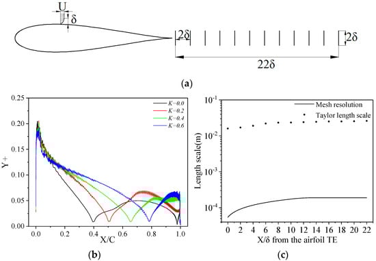 In order to ensure the accuracy of the simulation calculation, the Y+ value of each airfoil was less than 1 [28], as shown in Figure 4b. Additionally, in the LES, the Taylor length scale (λ) was examined to verify the sufficiency of the mesh resolution. According to Kuczaj [29], the mesh resolution () should at least be in the order of λ to completely solve the Taylor length scale. This method was applied to the wake of an airfoil, at Y/δ = ±1, since this is expected to be the area where the effects of the turbulence are most noticeable and, therefore, where the best resolution is required [30]; for data extraction, 11 spanwise planes normal to the streamwise direction located on the wake behind the airfoil were considered. These planes were located from 22δ from the TE (trailing edge), separated 2δ between each other, as shown in Figure 4a. Figure 4c shows that the criteria proposed by Kuczaj are fulfilled along the whole wake behind the airfoil, which means that the mesh is suitable for LES simulations. The details of the Computational Fluid Dynamics (CFD) model are presented in Table 1.