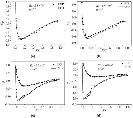 In order to verify the reliability of this simulation, experimental data obtained from references were used [31,32]. The experimental data included the pressure coefficient distribution of the original Joukowsky airfoil at different Reynolds numbers and different angles of attack. The expression of the pressure coefficient is as follows: