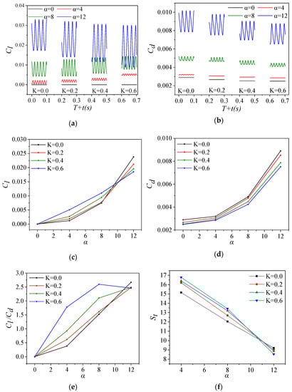 Aerodynamic performance of airfoil. (a) Time domain diagram of lift coefficient. (b) Time domain diagram of drag coefficient. (c) Lift coefficient at different angles of attack. (d) Drag coefficient at different angles of attack. (e) Lift–drag ratio at different angles of attack. (f) Strouhal number at different angles of attack.